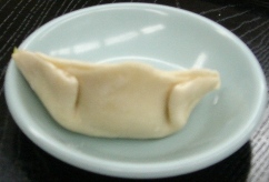 ぎょうざの皮に肉種をのせ、二つ折にして端をしっかりとめます。