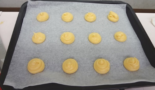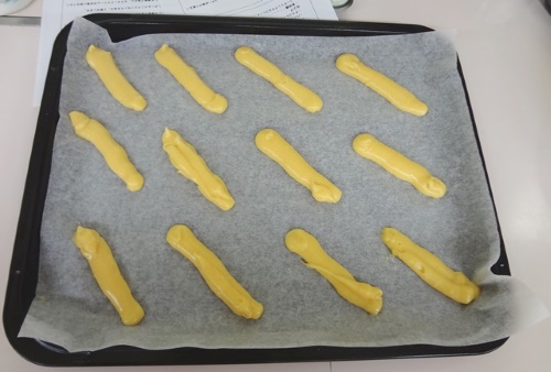 焼き上がったシュー皮は熱いうちに切り込みを入れ、冷まします。