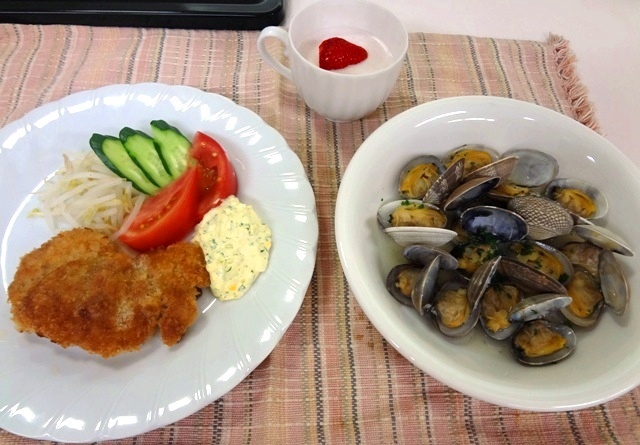 鶏のパン粉焼き あさりのワイン蒸し いちごのムース