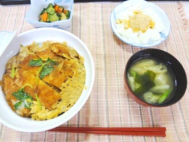 カツ丼 きゅうりのしょうゆ漬け 豆腐とわかめのみそ汁 ミルクわらび餅 ![]() |