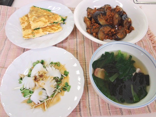 なすとひき肉のみそ炒め ニラ玉 いかの山椒ソース和え しろ菜のスープ