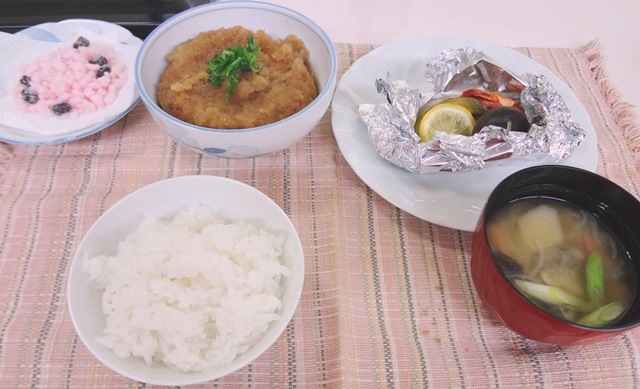 がんもどきのおろし煮 白身魚のホイル焼き 吹き寄せ汁 干し飯のひなあられ ![]() |