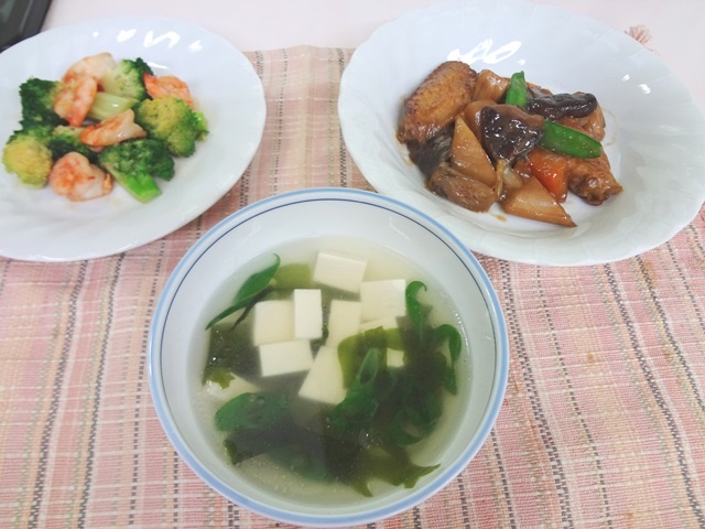 とり手羽先のしょうゆ煮込み えびとブロッコリーの炒め物 わかめと豆腐のスープ ![]() |