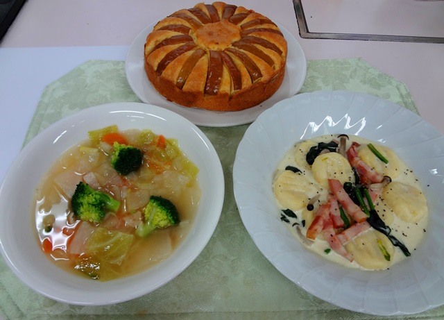 ・ベーコンとほうれん草の クリームニョッキ ・実だくさんの冬野菜スープ ・アップルトルテ
