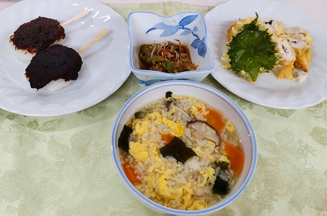 ・鶏ささみの梅じそ揚げ ・白菜のごまじょうゆ和え ・五目雑炊 ・五平餅